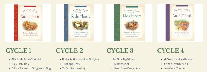 I have scheduled my favorite hymn books for kids, and though they’re out of print, I highly recommend trying to find a copy of each volume of Bobbie Wolgemuth & Joni Eareckson Tada’s Hymns for a Kid’s’ Heart. There are pictures of these books below, and a list of some sample hymns that are sung in each cycle (some of the hymns will be found in these books, but not all). There are other hymn study books scheduled as well (including several that are still in print and easy to find).