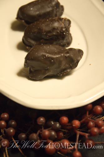 10. Dip the dates in the melted chocolate. Let the excess chocolate drip back into the pan. Set the chocolate coated date on the prepared pan.