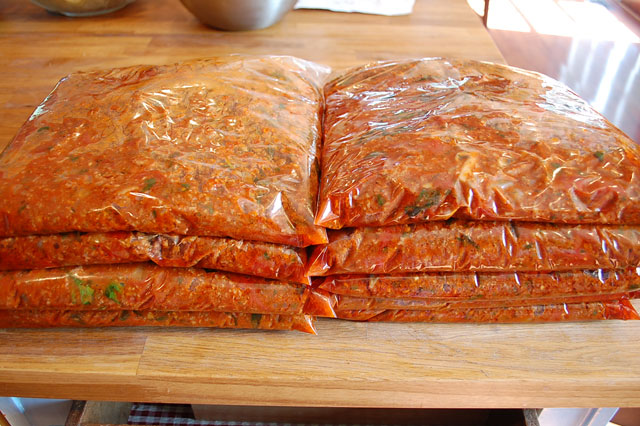4. At this point, you can freeze the mixture in 5 bpa-free plastic bags and label them "Zucchini Boats or Zucchini Lasagna Filling".