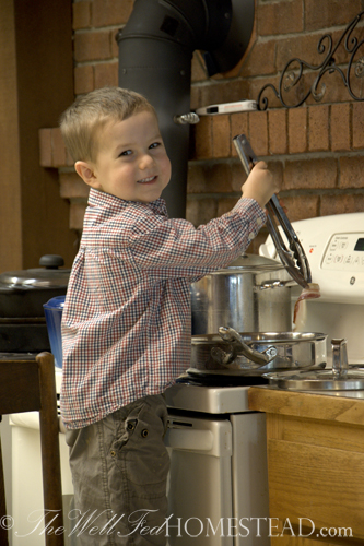 The above picture is of our three year old son, Auston, cooking one of his favorite foods (bacon with brussel sprouts although he says it, “becon wif pencil pouts”!). Now, I’m not advising that you let any young child cook by themselves (so you don’t need to leave a comment on the danger! =)!), but I do allow him to cook with me all the time!