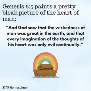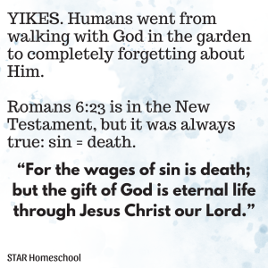 It’s hard to think about the flood that filled the whole earth and killed everyone but Noah and his family, because it’s really, really sad. I wish people’s hearts weren’t so selfish and sinful. I wish they didn’t have to die. But: “the wages of sin is death.” We first see this in Romans 6, but it was the truth all along.