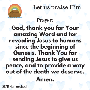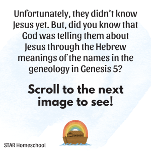Jesus hadn’t walked the earth in Noah’s days, but God was revealing Him all along. We saw that Jesus was a part of creation in Day 1. We saw that Adam and Eve were told about their seed that would crush the head of Satan in Day 2. And now, in Day 3, we see that the names of the people in the genealogy of Noah had meanings that prophesied the coming of Jesus.