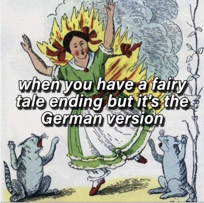 Fairy Tales, Fables and Myths are optional. Some mamas prefer not to read these stories to their children because there are some dark stories out there! (Grimm’s Fairy tales are particularly dark! Did you know Cinderella’s step sisters cut off their toes to fit in the glass slipper? Yes…Dark!). I found this funny meme online that kind of explains what I’m saying here (Grimm was German):