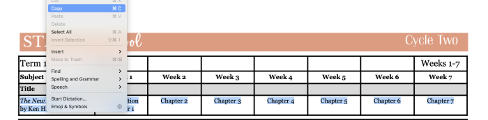 Open the pdf download you’ve chosen and highlight one row on the first spreadsheet with the title, author and assignments for Weeks 1-7, like this (the blue part is highlighted):