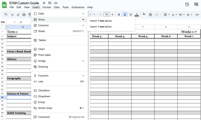 Now, head over to the copy of the Custom Guide spreadsheet that you have made. Make sure you are on the tab of the same Term as the spreadsheet you copied from. You can select the term at the bottom of the spreadsheet.