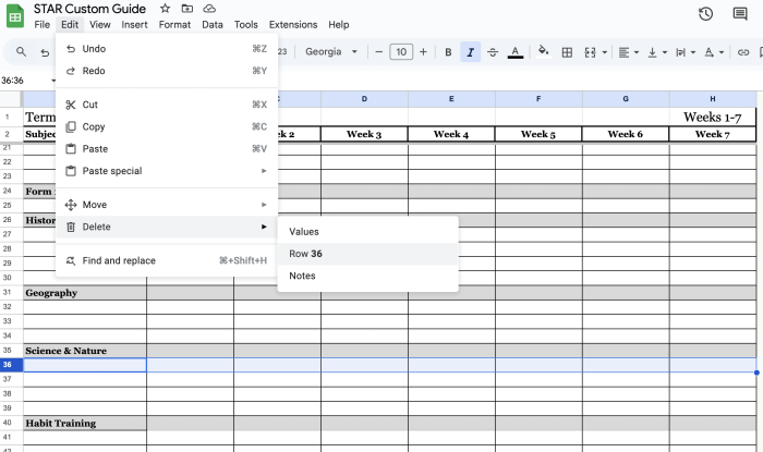 Then, go to the top menu and click “Edit,” and then “Delete,” and click on the line that says “Delete Row __” (whichever row you have selected), like this: