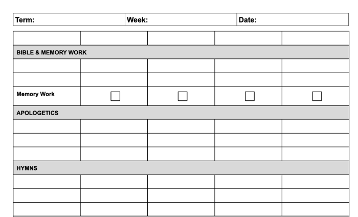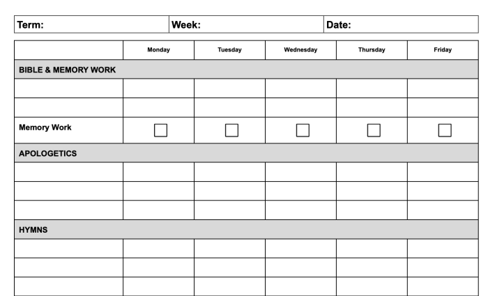 This chart has a column on the left for the resource or book title, and then a column for each day of the week, where you can fill in the assignment. The subjects include: Bible & Memory Work, Apologetics, Hymns, Read Aloud Books, History, Geography, Science & Nature, Enrichment & Character, Math, and Language Arts. There is also a blank line to fill in a subject of your choice. This is a two-page spread. Feel free to print it back-to-back, or so that it will be side-by-side, whichever you prefer! You will want to print 28 copies of this for the whole year.