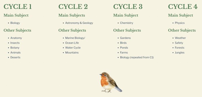You will notice that some cycles have more topics than others. This is because some topics (like Biology) are broad and cover a lot, and may be repeated a couple of times. And, some topics line up naturally with other topics. Do not feel pressured to study every single topic! Choose your favorites and then choose to enjoy your time focusing on those topics.