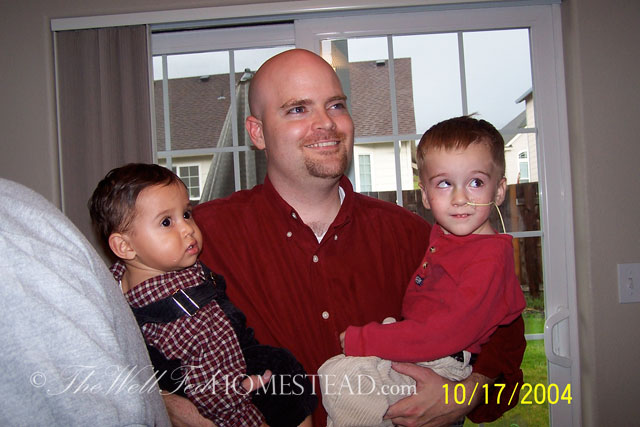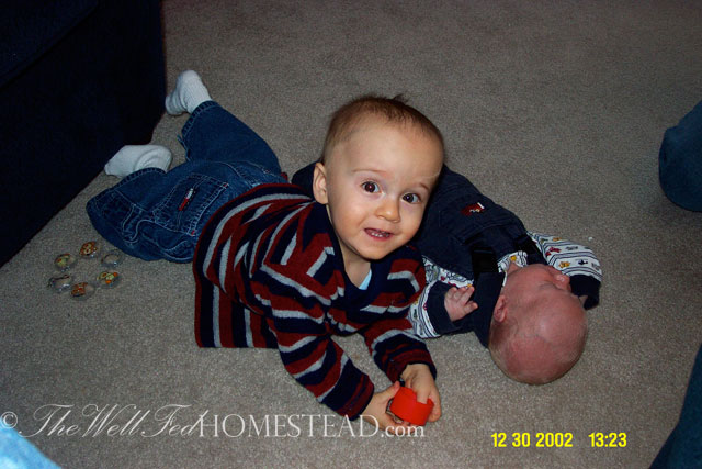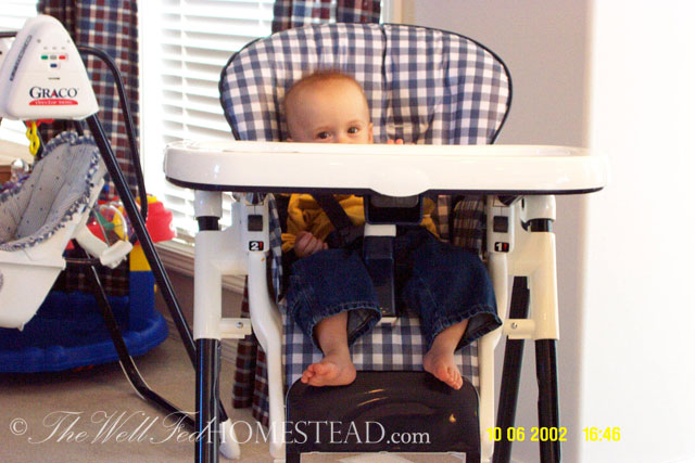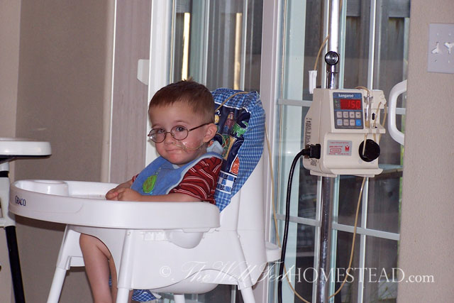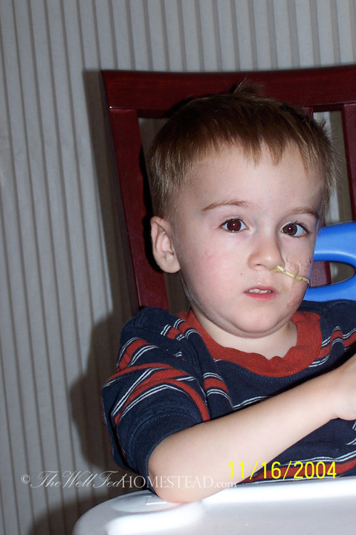 He ended up with a nasogastric feeding tube to help him grow. We would let him eat for 10 min, then start the drip feeding. We also ran it through the night. It was difficult figuring out how much to give him, because he vomited easily, and then the tube would come out, too. We learned that our nearest ER did not have anyone trained in placing an NG tube back in–The Farmer and I had to get trained. I would wrap him up in a blanket and hold him tight while The Farmer very carefully stuck the tube down his nose, praying that it didn’t accidently slip into his lungs. I woke up a lot during the night when he was getting drip feedings. What if it accidently went into his lungs? What if the tube strangled him? Oh the restless nights of a worried mom!