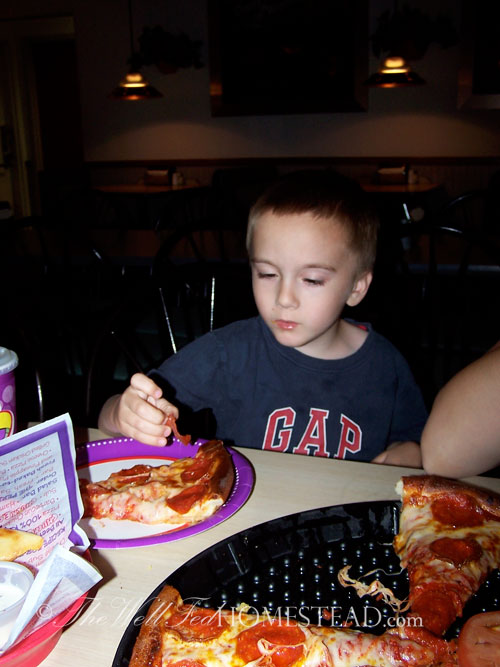 We discovered that his favorite food was pizza. August 2006 (almost 5 years old) he ate an entire piece of pizza for the first time in his life. For the next several months, we had pizza once a week to try to duplicate the success.